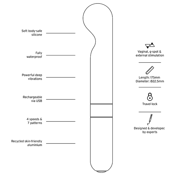 ●素材:シリコン、リサイクルアルミニウム、リサイクルABS樹脂、バイオプラスチック●充電方法:USB●充電時間:フル充電2時間●連続使用可能時間:最大1時間●振動パターン:10(振動強弱4段階+リズムパターン6種)●防水:完全防水(IP67)