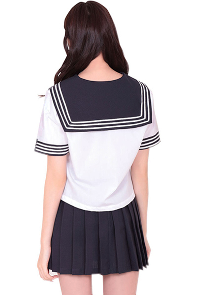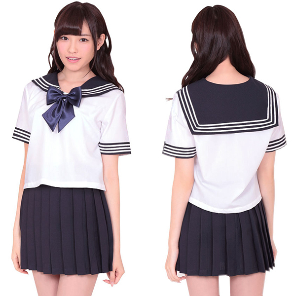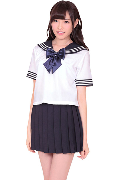 セーラー服の定番、白のブラウスにプリーツスカートのセット!胸元には紺色リボンをトッピング!袖と襟の白い3本ラインが学生らしいデザイン!可愛いセーラー服コスチュームに身を包んで、思い出に浸っちゃって下さい。
