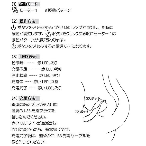 ●高品質シリコン仕様の優しい肌触り●丸みのある愛らしいグリップ部●薄めの先端がGスポットを刺激●中央の内蔵モーターでCスポット(クリ)を刺激●多彩な刺激を生み出す8パターン振動●メンテナンスしやすい生活防水●約2時間の充電で最大1時間稼働●USB充電用ケーブル付属。