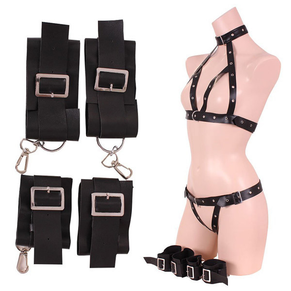 ●スタッズ付きのブラックレザー風●ベルト留めのホルターオープンブラ●サイズ調節可能なオープンショーツ●ベルト式の手枷と足枷もセット●リング付きで連結可能。