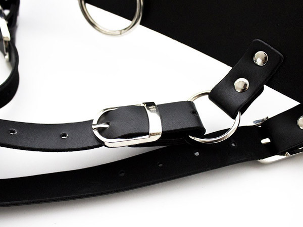 ●ハードなフェイクレザー素材●ウエスト調節できるベルト穴式●電マ用ベルト直径約3〜6φcm●アジャスターで長さ調整が可能●他拘束具と連結できるリング付き。