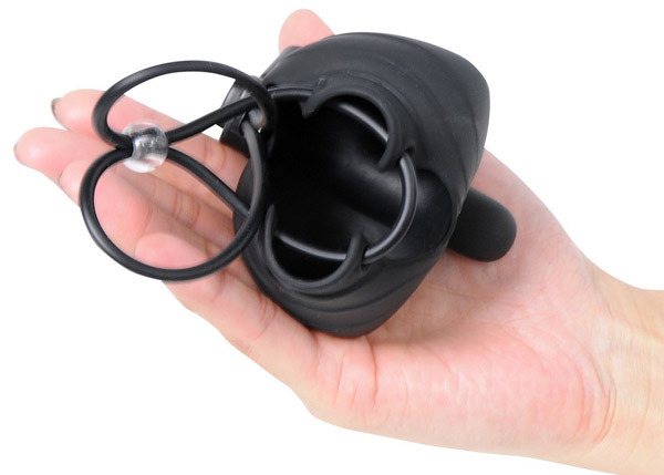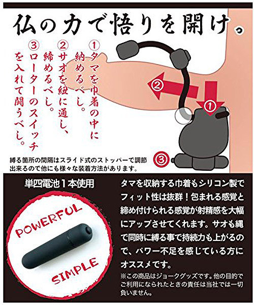 玉袋をシリコン巾着の中に納めてからサオを縄に通して縛り、ローターのスイッチをON!締め付けによる持久力UPだけでなく、玉袋を包んで振動を与えることで射精感も大幅にUP!快感もパワー不足もアシストしてくれるマルチなアイテムです。
