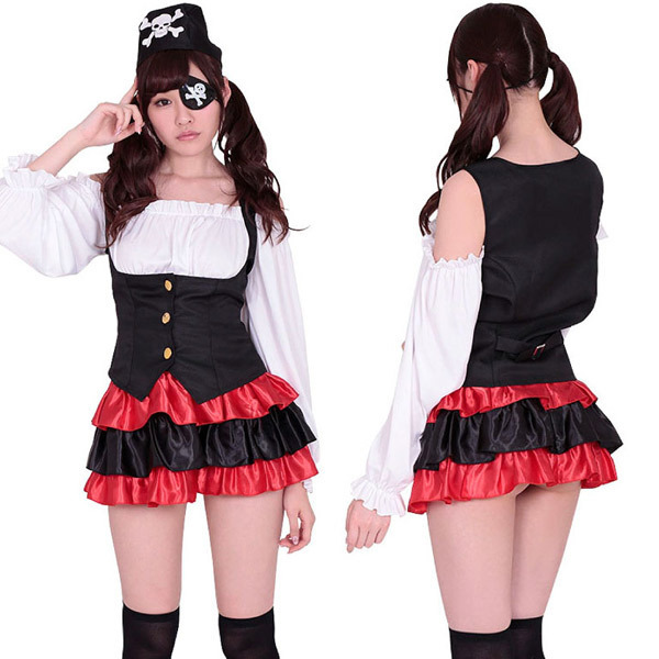 オフショルダーブラウス付きのベストと、黒×赤カラーの光沢ティアードフリルスカートのセット!眼帯&スカーフ帽の小物も付属した充実セットのパイレーツ衣装です。