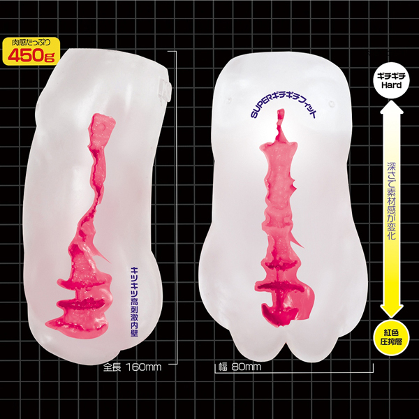 高刺激なハード素材を採用で、外は透明、中は粘膜をイメージした紅色カラーの贅沢2層構造!奥へ進むほど内壁が全体にギチギチっとフィットし、根元から先っぽまで搾り取られるような刺激に絶頂必至♪ヴァージンループの中でどれが良いかお悩みなら、ヴァージンループハードに負けず劣らず高刺激なこちらのオナホールもおすすめ。