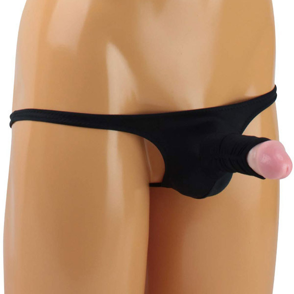 亀頭をチラリと覗かせセクシーにアピールする日本製のVバック(メンズ用)。