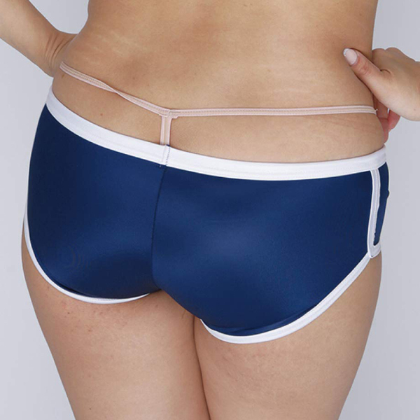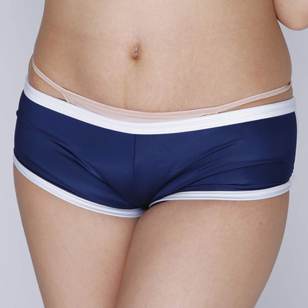 柔らかな光沢と伸縮性が特徴的なストレッチ生地を採用!穿き心地抜群なブルマ風ホットパンツ(ネイビー)。