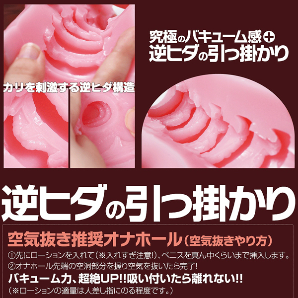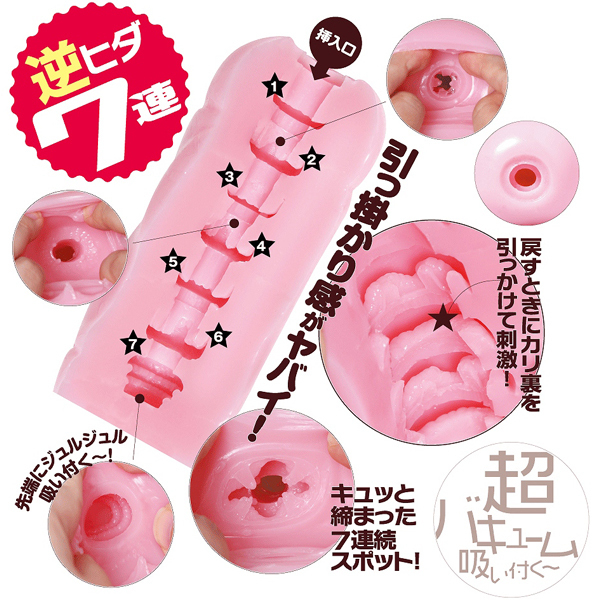 超強力バキュームと7連続する逆ヒダ構造が刺激する日本製の非貫通オナホ(国産ローション付属)。