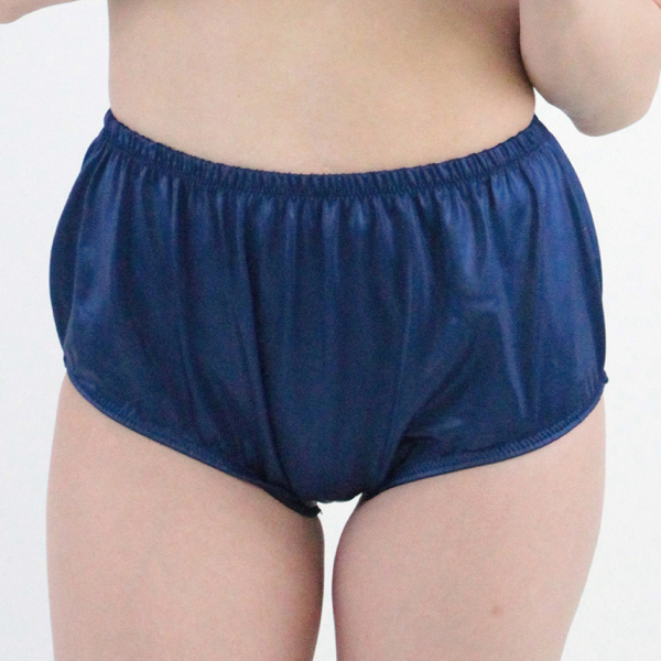 ゆるりとしたシルエットがどこか懐かしさを感じさせる光沢のある日本製ブルマ(紺)。