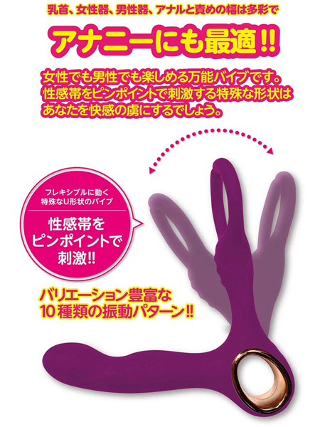 手触り滑らかで丸洗い可能な高級シリコンを使用!U字形状のボディは柔らかなフレキシブル仕様と10種類の振動パターンで、敏感な部分をピンポイントに刺激する♪乳首や女性器、男性器、前後ろ問わず楽しめる万能バイブです。