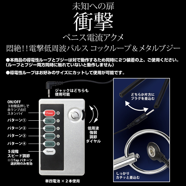5段階のスピード&4種類のパターンから選べる電撃低周波刺激♪悶絶必至の電流刺激に未知なる扉が開かれる!他にも拡張に応じて使えるアタッチメントを多数販売中◎ループはお好きなサイズにカットして使用していただけます。