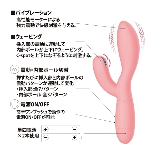 機の先端に内蔵された「上下にスライドするボール」により、指先でこねくり回すようにCスポットを刺激する快感バイブレーター!更に挿入部に内蔵された強力震動モーターが、Gスポットを同時に絶頂刺激!シリコン製の程よい柔らかさのボディで挿入感抜群です。