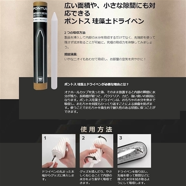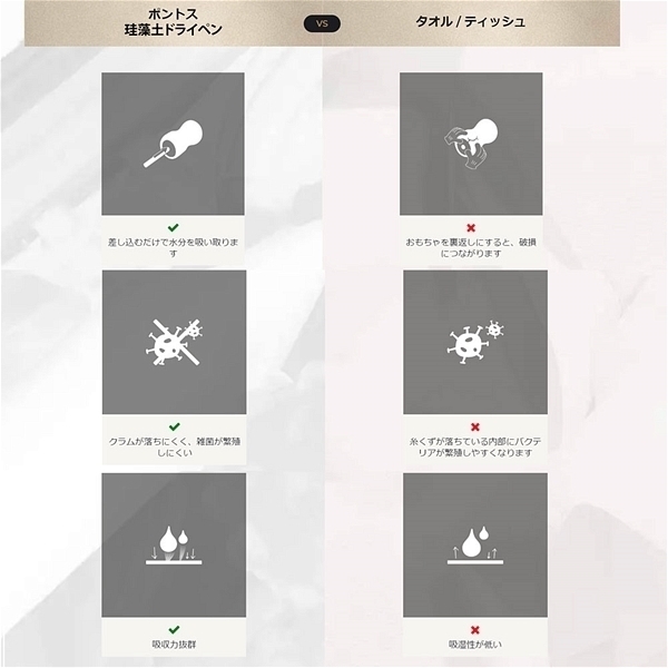 ポントス珪藻土ドライペンは、おもちゃの水分を奥まで吸収し、おもちゃを何度もひっくり返すことによる損傷を防ぎます。