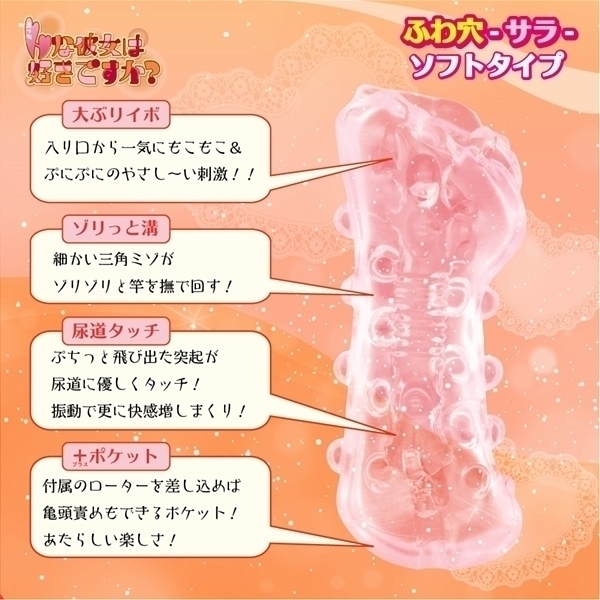 快感・尿道タッチ!ソフトな柔弾力!入り口から大ぶりなイボがぷにぷに優しく刺激!中盤に細かい三角溝がゾロゾリと竿を撫で回す!そして奥はプチっと突起が尿道に優しくタッチ!最奥ポケットに付属のローターを差し込み、亀頭を刺激し気持ち良さ倍増!!!