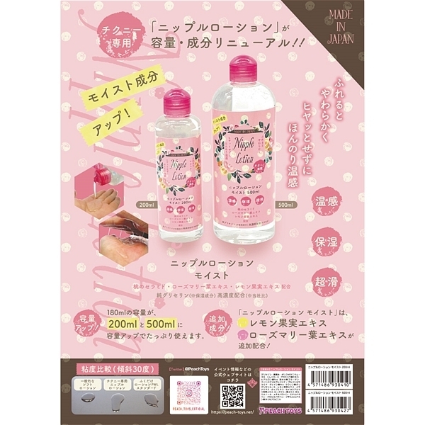 追加成分!「ニップルローション モイスト」は、レモン果実エキス・ローズマリー葉エキスを追加配合!チクニー専用ニップルローションは、ふれるとやわらかくヒヤッとせずにほんのり温感タイプでとても使いやすい商品です。