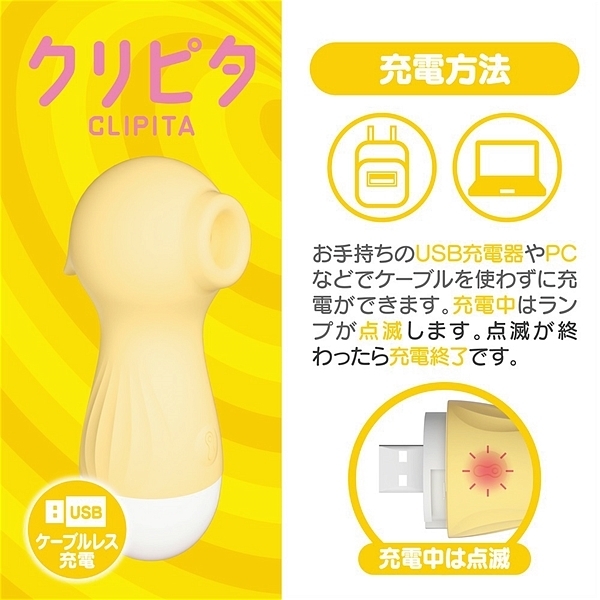吸い付いて震えるクリピタは、シリコン素材で柔らかい触感とケーブルレスで簡単充電が特徴の吸引グッズ。