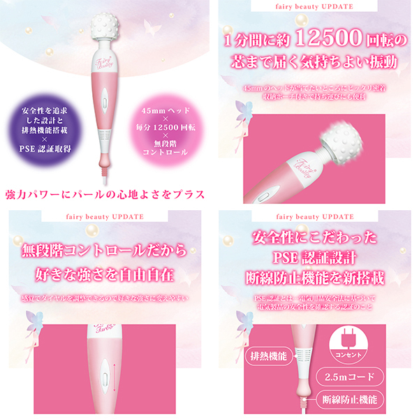 フェアリーシリーズのハイスペックモデル「フェアリービューティ」がアップデートして登場♪パールヘッド仕様でやさしい肌あたりと心地よさを実現♪毎分12,500回転の強力振動でしっかりサポートします!無段階コントロール機能によりお好みの強さに調整可能♪排熱機能を搭載し長時間でも快適な使用感をキープします!断線防止機能つきでコードの耐久性もアップ♪PSE認証取得済みで安全性も抜群です!2.5mのロングコードで取り回しもスムーズ♪使いやすさと機能性を兼ね備えた1台です!収納ポーチ付きで保管や持ち運びにも便利♪毎日のケアタイムに活躍するハンディマッサージャーです!