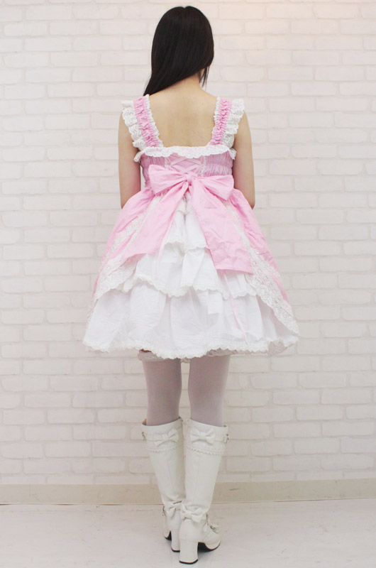 甘ロリピンクが可愛い!豪華なフリルレースで仕上げたシャーリングジャンパースカート(M)。