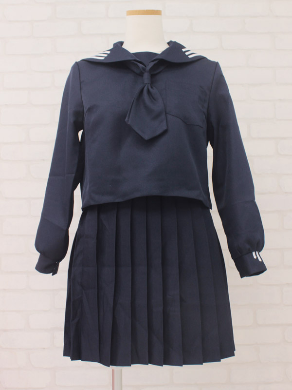 冬服仕様のセーラーブラウスにプリーツスカート、紺色スカーフのセットです!セーラー襟と袖のデザインがお洒落なお嬢様風制服コスチュームです。