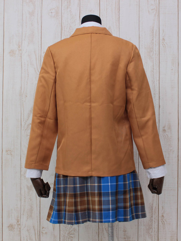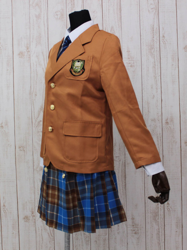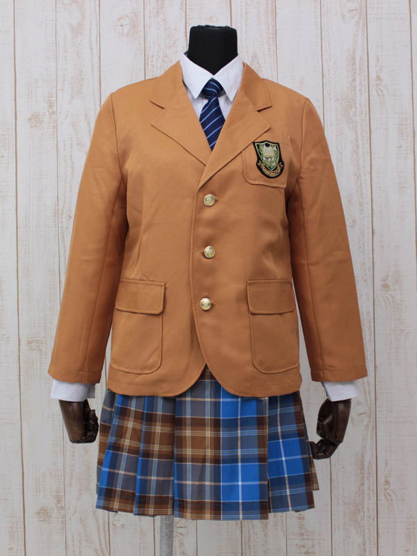 ●フロントを金ボタンで留めるキャメルブレザー●胸ポケットに紋章風の刺繍ワッペン付き●6つの金ボタンがあしらわれた青×キャメルのチェックスカート●斜めストライプ柄ネクタイも付いた4点セット。