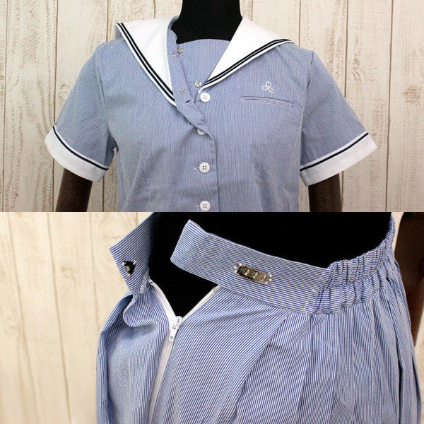 セット内容:セーラー上衣(胸当てスナップボタン2点有、前開きボタン留め、胸ポケット有)、スカート(サイドファスナー、3段ホック留め、サイズ調整:ウェスト背部に一部ゴム入り) 素材:ポリエステル100%