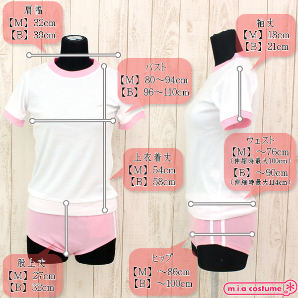 Mサイズ B80〜94cm・W〜76cm(伸縮時最大100cm)・H〜86cm 上衣:着丈54cm・肩幅32cm・袖丈18cm ブルマ:股上丈27cm