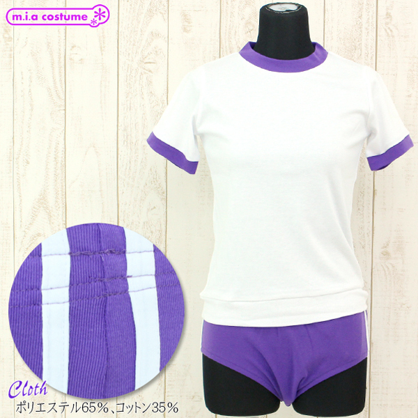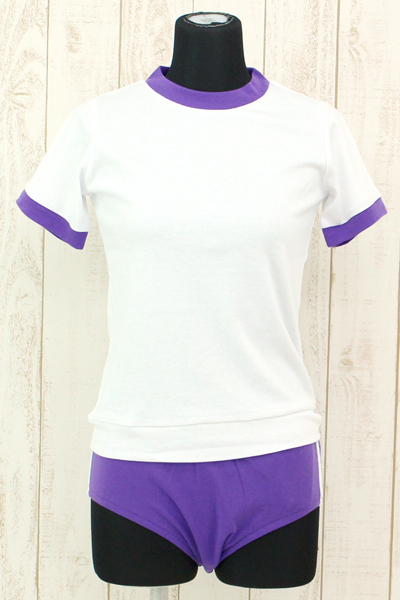 深めの紫ブルマに2本の白ラインを施した白トップスとの上下セット。