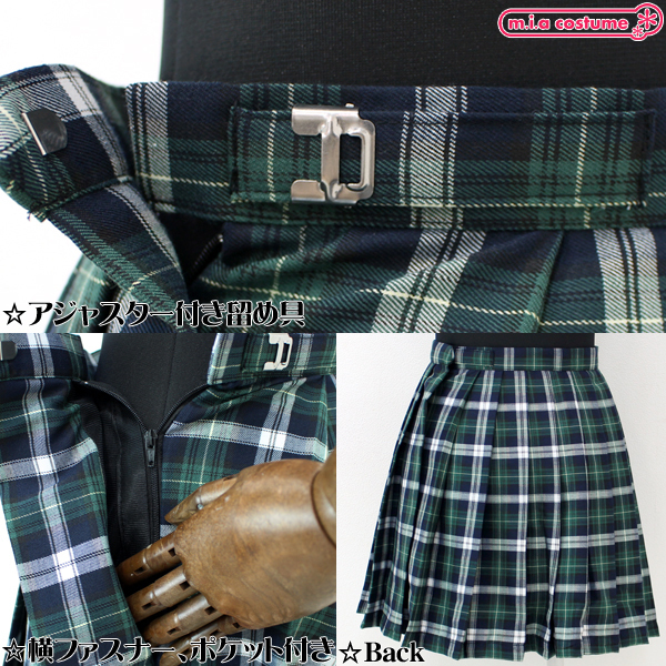 横ファスナーを上げて、ウエスト部分のアジャスター付き留め具を引っ掛けるだけで簡単装着!自分好みの制服アレンジで気分を上げよう♪ポケット付き、落ち着きのある緑×白カラー。