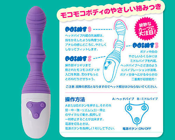 先端と中間に静音モーターを搭載しており、竿のカーブは腸壁に当てやすい角度で完全固定されています♪下ボタンで電源をオン・オフすることができ、右ボタンで先端モーター、左ボタンで中間モーターを操作することが可能!強弱3種類とリズム3種類を組み合わせた計6種の振動パターンを個別に設定でき、スリムで使い勝手の良いボディで長押しで一時停止もできます。