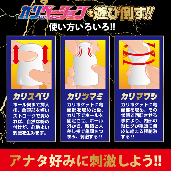 挿入し、擦ったり引っ張ったり摘まんだり、あなた好みに刺激すればカリコキ爆快感が得られます!挿入口はスリ鉢状になっているので、全体にローションを塗り広げられるからとっても便利。