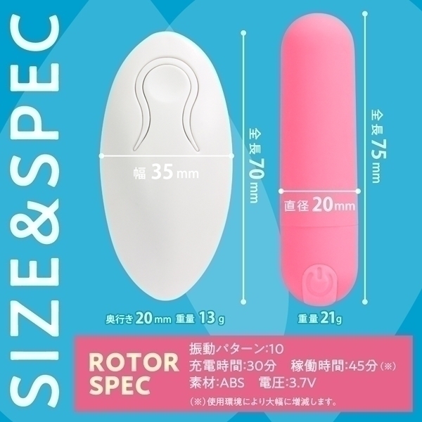 パッケージ:ヘッダー14.5×8.8×3.0cm ローター 7.5×直径2.0cm リモコン 7.0×3.5×2.0cm USB充電式
