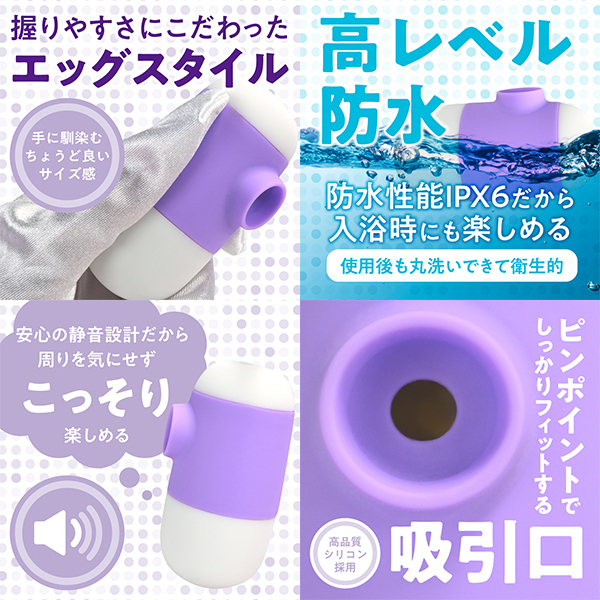 手にフィットするエッグスタイルの吸引ローターです♪可愛いタマゴ型デザインに、高性能な静音モーターを搭載!上部に配置されたボタンで、操作もスムーズに行えます♪吸引口には柔らかく高品質なシリコン素材を使用し、ピンポイントで心地よくフィット!7パターンの吸引アクションを搭載しており、強弱の調整も自在に楽しめます♪120分の充電で、最大約90分の連続使用が可能!(使用状況により変動します!)IPX7相当の高い防水性能を備え、水洗いもできて清潔に保つことができます♪可愛さと機能性を兼ね備えた、使いやすさ抜群のアイテムです!