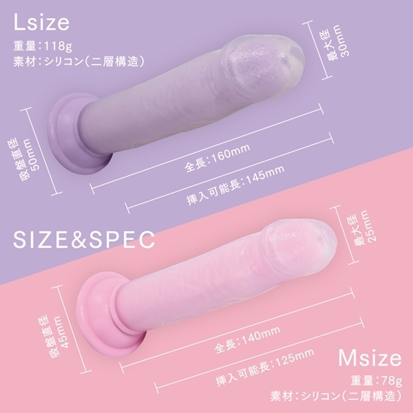 芯のある構造とぷにっと柔らかい外層が魅力のディルドアイテムです♪全長約14cm、挿入可能長は約12.5cmと程よいサイズ感で、扱いやすさも抜群です!内部は硬めの芯素材で安定感があり、外側は柔らかく肉感のある素材を採用しています♪中外ともに高品質なシリコンを使用し、安全性とリアルな質感を追求しています!吸盤付きなので壁や床にしっかり固定でき、両手を自由に使えるのも嬉しいポイントです♪ズレにくく、好みの角度で安心して使用できます!見た目はクリア×パープルのカラーリングで、可愛さと大人っぽさを両立したデザインです♪リアルな形状と素材感で、満足度の高い使用感を提供します!初めての方にもおすすめできる、実用性とビジュアルを兼ね備えたモデルです♪毎日のセルフケアをちょっと楽しくしてくれる一本です!