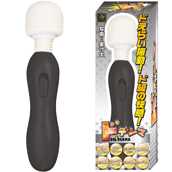 ドえらい振動がドドーンと炸裂!超ド級の握り易さもめっちゃ嬉しいお手軽電マ『ドデンマ』がより可愛いカラーになって新登場!パッケージもリニューアルし、ソフトラバーヘッド&フレキシブルネックだから優しい当て心地です♪耳障りな音をカットした静音設計になっておりスイッチは使いやすい強弱2段階!カラー:ブラック