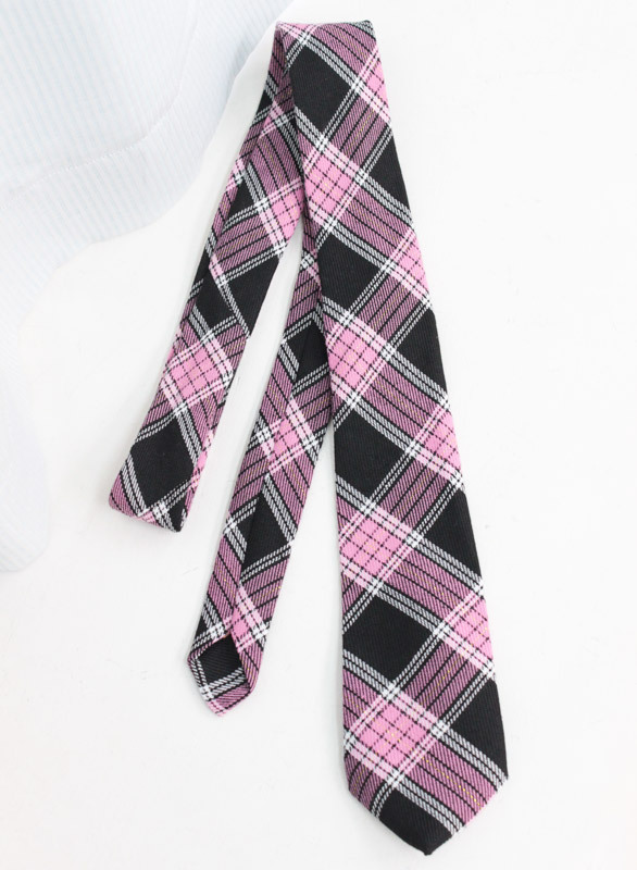 手軽なマンネリ対策として、コスプレ小物をチェンジ!襟元のリボンを、白シャツに映える大人可愛いチェックのネクタイに変えてみませんか?