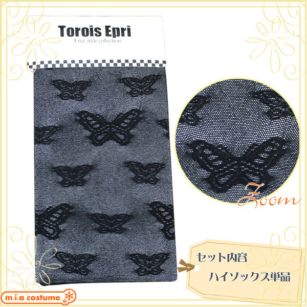 > 【100円★数量限定】蝶柄ハイソックス 黒 フリーサイズ<お一人様1点限り>