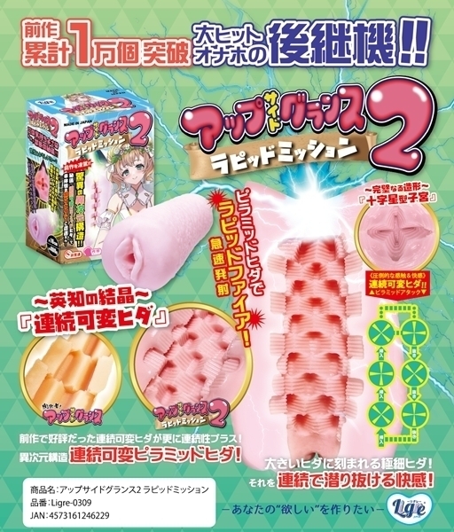 大ヒット商品「アップサイドグランス」の進化版として登場しました♪内部には1cm単位で変化する独自のヒダ構造を採用し、新たな使用感を実現!大きなヒダの中に繊細な極細ヒダを重ねることで、連続する変化に富んだ刺激を体感できます♪非貫通タイプでしっかりとした密着感があり、圧迫と包み込みを同時に楽しめます!素材はエラストマー製で、やや柔らかめの弾力が心地よくフィット♪本体は手に収まりやすいサイズ感で、操作性にも優れています!付属のローションを使用すれば、よりスムーズな挿入が可能♪シリーズの特徴である可変ヒダ構造をさらに進化させ、より立体的な刺激を追求しました!長時間の使用でも飽きのこない設計で、繰り返し楽しみたくなる仕様です♪進化した構造で、新しい刺激を求める方におすすめの一本です!