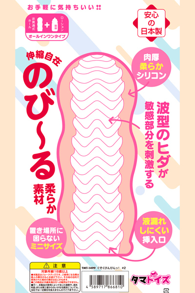 手軽に使える携帯タイプ♪肉厚柔らかシリコン使用!ウエーブタイプで波型のヒダが敏感部分を刺激する非貫通オナホール!伸縮自在の、のび〜る柔らか素材なのに、液漏れしにくい挿入口!舐めても安心・安全な日本製のローション付きのオールインワンオナホ。