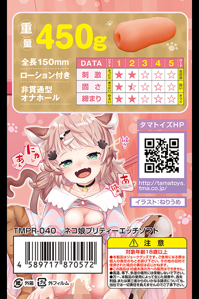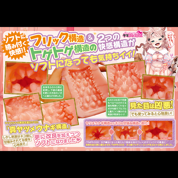 」です♪ネコ娘の甘噛みをコンセプトに開発されたオナホで、タマトイズで人気のヤツメウナギ構造を進化させ、フワトロ系にしたことで大きめのイボのような刺激を実現!アウターはシンプルな筒型で挿入口はポチ穴♪フレキシブルな弾力感のある素材感でサイズ的にミドルサイズ!弾かれるようなフリック構造の内部とびっしり配置された2種類の突起イボが、絡みつくような快感を存分に味わわせてくれます♪●メーカー型番:TMPR-040