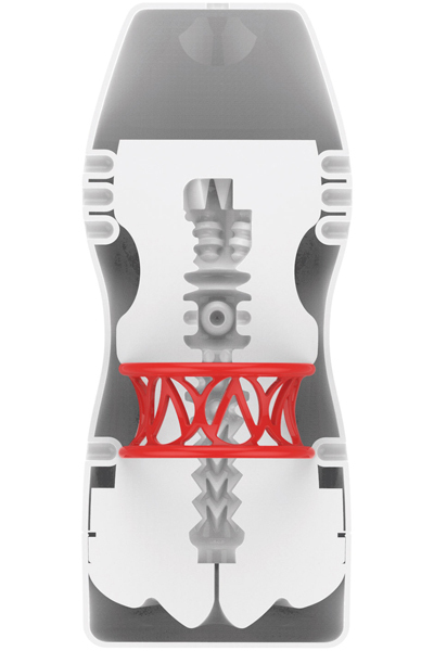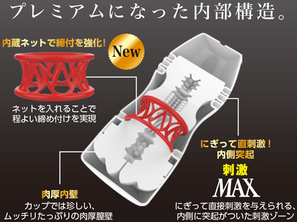 むっちり肉厚な内壁に全体を包み込まれながら、外側から握ってダイレクトに刺激!内側の突起が締め付けと組み合わさり強力な快感をもたらす。