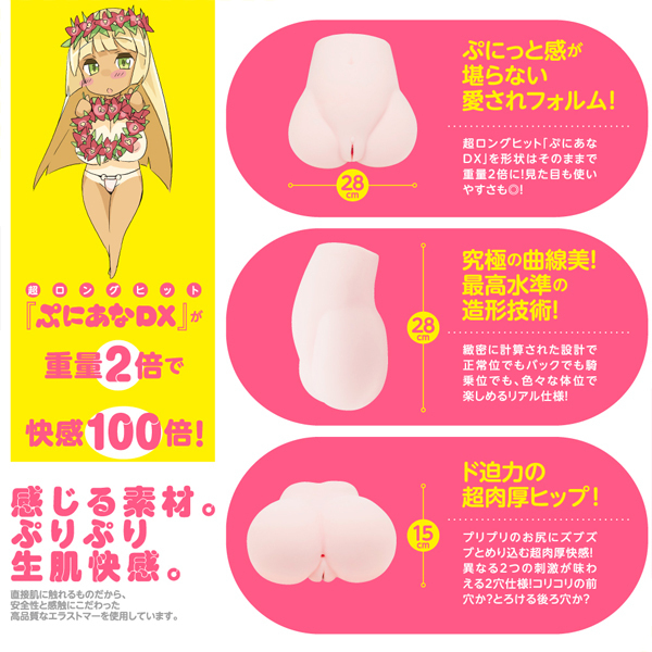 「ぷにあなDX」が進化して、とろける極尻と超重量約5.7kgの「ぷにあなDX極」が登場しました!高弾力の骨盤シリコン内蔵で、安定感抜群のクビレと巨尻を実現し、満足度はMAX♪2層構造の極上ヒップは、揉み心地にもこだわり、内層はトロトロの超やわらか素材で指がズブズブと沈み込むリアルを越えた揉み心地!外層は、弾力性のあるしっかりした素材で、耐久性が高く、強く揉んでも型くずれしにくいです。