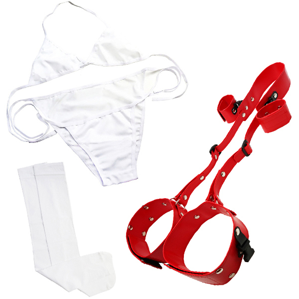 M字開脚の無防備な状態でパートナーの体勢を固定!ただ見て楽しむも良し、様々な角度から責めても良し、全ては貴方の思うがまま♪パッケージモデルの「上川星空」さんが着用しているブラ+紐パンツ+ニーハイもセットになっているので、届いたその日に直ぐイメージ通りに楽しめます。