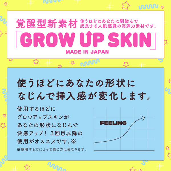 高い伸縮性&耐久性を誇る覚醒型新素材「GROW UP SKIN」採用!肉厚300g、ギュっと締め付け絡みつく非貫通オナホ。