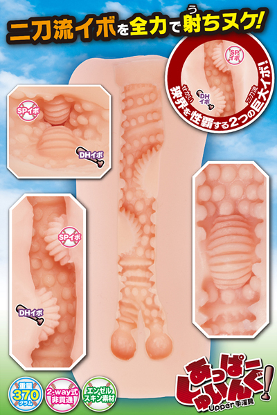 (Upper手淫具)は、ロングセラー商品「ふるしゅいんぐ!(FULL手淫具)」の続編となる、全長165mm、重量370gのミドルオナホールです(2way式非貫通)。
