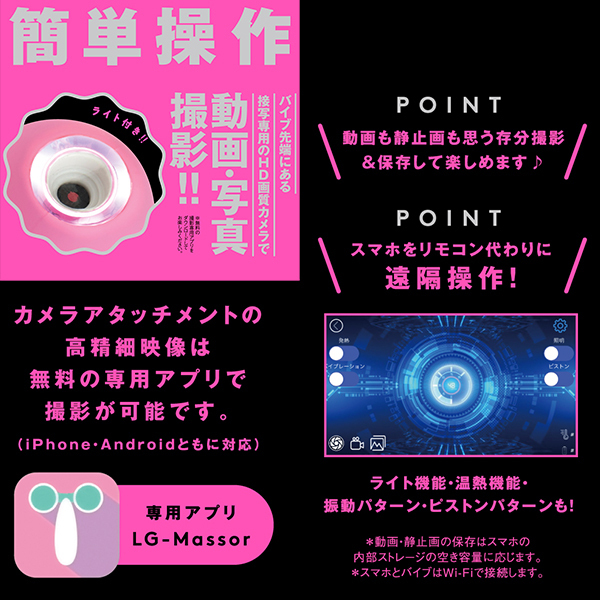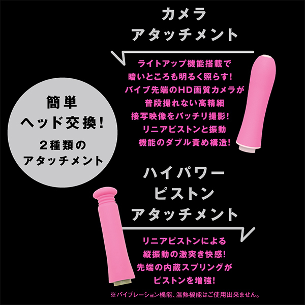 ライトアップ機能がついたアタッチメントで動画撮影や写真撮影も楽しめる!パートナーのあそこのナカを見たい欲求を満たしてくれるとともに、温感を楽しめるバイブとしても優秀なのでハイパワーピストンとリニア式のピストンアクションで極上の快感を体験できます♪お好みのリズムで感じられる9パターンのバイブ振動にリニア振動による重厚な奥突きピストン10パターン!高品質シリコン仕様でやさしい肌触りを確かめながら、温熱機能搭載で人肌感覚のぬくもりもお楽しみ頂けます。