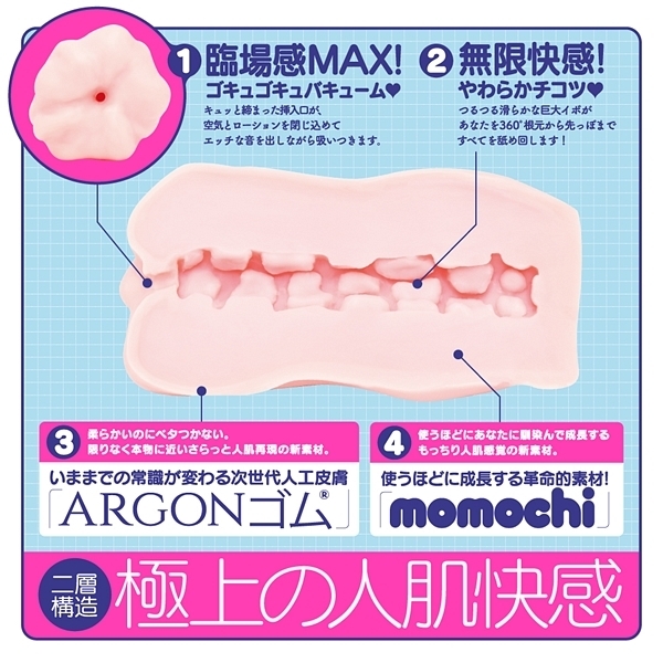 」です♪計算された内部構造にローションと空気の黄金比!極上の「ギュポギュポ」する吸い付きと挿れ心地は絶品です♪外層は柔らかいのにベタつかないさらっとした人肌再現の新素材を使用!内層は使うほどに成長する革命的素材「momochi」を使用することで、使えば使うほどにあなたに馴染んで成長するもっちり人肌感覚がたまりません♪劣化しずらい高い耐久性や弾力性も魅力的!2層構造が極上の人肌快感とキュッと締まった挿入口、そしてストロークの度にエッチなギュポ音を発する使用感が聴覚からもイキを誘発してくれそうです♪素材は安心の国産素材&国内生産。