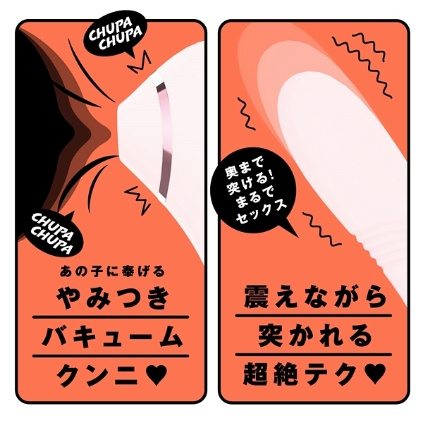 クリトリス吸引が気持ちいい!クリをチュパチュパ吸われながら反対側のバイブで振動刺激も楽しめる吸われて突かれてイキ尽くしの愛を感じる吸引ピストンバイブです♪病みつきになるバキュームクンニは9種の多彩な吸引パターンを搭載。