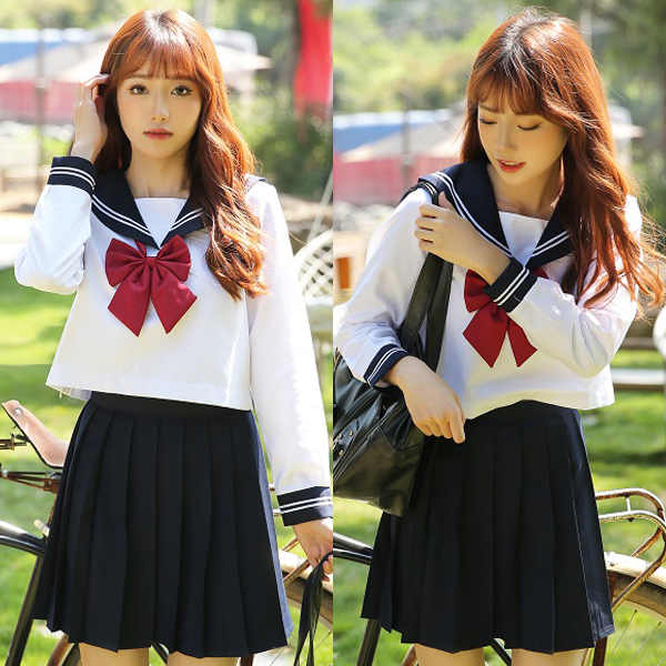 清潔感溢れる紺と白の制服を、真っ赤な大きいスクールリボンで華やかに魅せた長袖仕様のセーラー服。